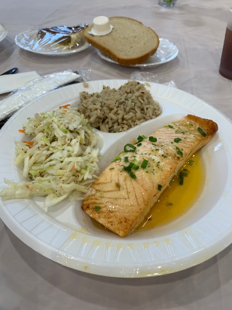 Our Lady of the Pillar was again a top-notch fish fry! OLP earned our first 5.0 🐟🐟🐟🐟🐟 on the 5 fish scale! In addition to traditional fried cod, they offered baked cod, baked salmon, fried shrimp and cod nuggets. They also offered crab rangoon! Sides included slaw, brown ride, tater tots, hush puppies, spaghetti, green beans, and mac & cheese. All dinners included 2 sides and dessert. Homemade mac & cheese, hush puppies, and desserts were all excellent as well. Ample parking, 4 lines for ordering food and 2 lines to get your food all helped to move things along quickly. Very crowded but plenty of seating. The only minus was styrofoam plates. Great job OLP! Next week we will be going to St Clement of Rome. See you there!
